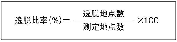 表13に示す維持すべき値を逸脱した地点数(「逸脱地点数」という)と、測定地点数に対しての逸脱地点数の比率(「逸脱比率」という)を用いる。逸脱比率は、次の算出式で求められる。