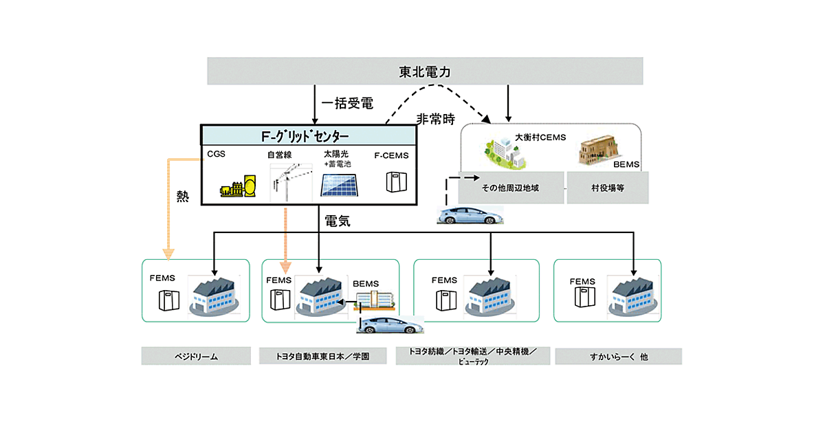 宮城県黒川郡大衡村では、第二仙台北部中核工業団地「F-グリッド」(Factoryグリッドの意)を核としたスマートコミュニティ計画として、トヨタ自動車の工場を中心に、工業団地および地域コミュニティにおけるエネルギーの「セキュリティ向上注2」「環境性の向上」「経済性の確保」を総合的にマネジメントすることを目標として事業を進めている(図1)。