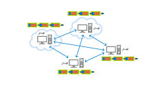P2P:Peer to Peer(ピア・ツー・ピア)。複数のコンピュータ端末が対等の立場で通信するネットワークの仕組みを指す。