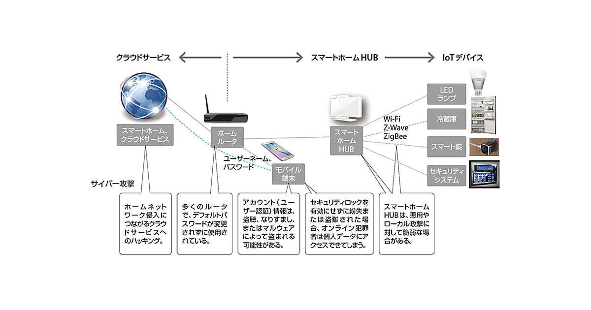 IoTデバイス:ここでいうIoTデバイスとは、ネットワーク機能を備えた、ゲーム機や、LEDランプ(照明器具)、エアコン、冷蔵庫などのデバイス群を意味している。