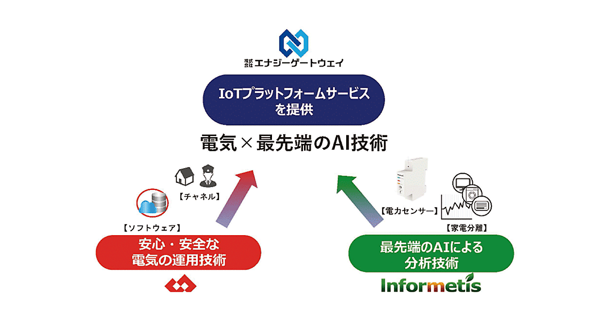 図1からわかるように、エナジーゲートウェイは、東京電力PGの安心・安全な電気の運用技術と、インフォメティスがもつ最先端のAIによる分析技術を掛け合わせた「電気×AI技術」によって、新IoTプラットフォームサービスを提供し、新ビジネスを展開していく新会社として設立されたのである。