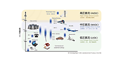 この図からわかるように、直流は、データセンター(クラウド)から太陽光発電(PV)、照明器具(LED)、電気自動車(EV)や地下鉄や鉄道などの交通輸送分野に至るまで、非常に幅広い市場で、使用されている。
