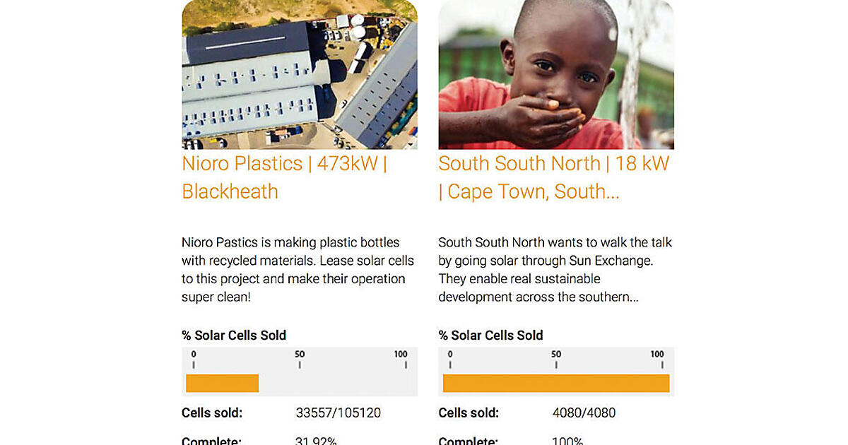 2015年から南アフリカで活動しているザ・サン・エクスチェンジは、太陽光発電所のクラウドファンディングである。同社のWebサイトにはプロジェクトが並び、投資家が投資したいプロジェクトを選んで投資を実施する仕組みが紹介されている(図2)。現在のところ、これらのプロジェクトは、ザ・サン・エクスチェンジの運営メンバー自身によって組成されているようだ。