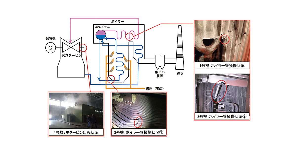 地震発生の直前は、北海道全域の総需要310万kWのうち、約50%にあたる約150万kW(1,492MW)の電力を苫東厚真(とまとうあつま)火力発電所(石炭火力)が発電するという、一極集中の発電状態であった。地震によって、図1に示すように、この苫東厚真火力発電所の1号機(35万kW)と2号機(60万kW)ではボイラー内蒸気配管の損傷、4号機(70万kW)ではタービンの不具合(出火)が確認された(なお、3号機は2005年に廃止されている)。