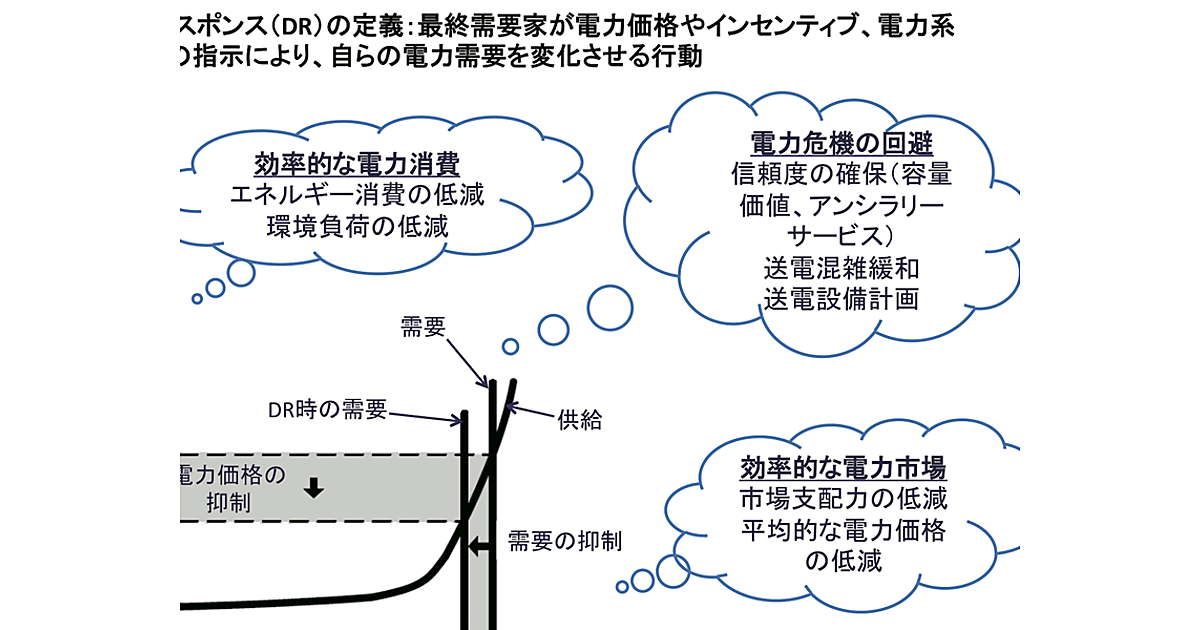 現在のような電力規制が行われている状況での電力会社と需要家の関係(デマンドサイド・マネジメント)とは異なり、デマンドレスポンス(電力の需給調整)は、電力自由化によって登場している電力市場の卸価格と小売価格を連携させるものであり、より電力の市場競争に適合した概念として期待されている。また、国内外で、従来の電力系統(電力システム)と大量な再生可能エネルギー電源の連系が進む中で、電力品質を維持するアンシラリーサービスに、需要側の電力資源(太陽光発電など)を参加させる動きも具体化してきている。