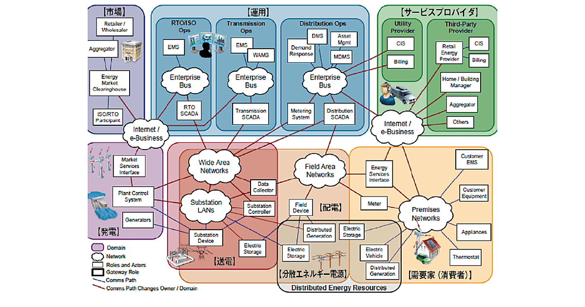 NISTでは、スマートグリッドの「概念参照モデル」を開発するにあたり、図2に示すように、スマートグリッドを7つの領域、すなわち「市場、運用、サービスプロバイダ、発電、送電、配電、需要家(消費者)」の領域(ドメイン)に分け、各ドメイン間の「通信の流れと電力の流れ」を整理した。これをベースにNISTでは、スマートグリッドの「概念参照モデル」(コンセプトモデル)が策定された。これが図3に示すスマートグリッドの「概念参照モデル」である。
