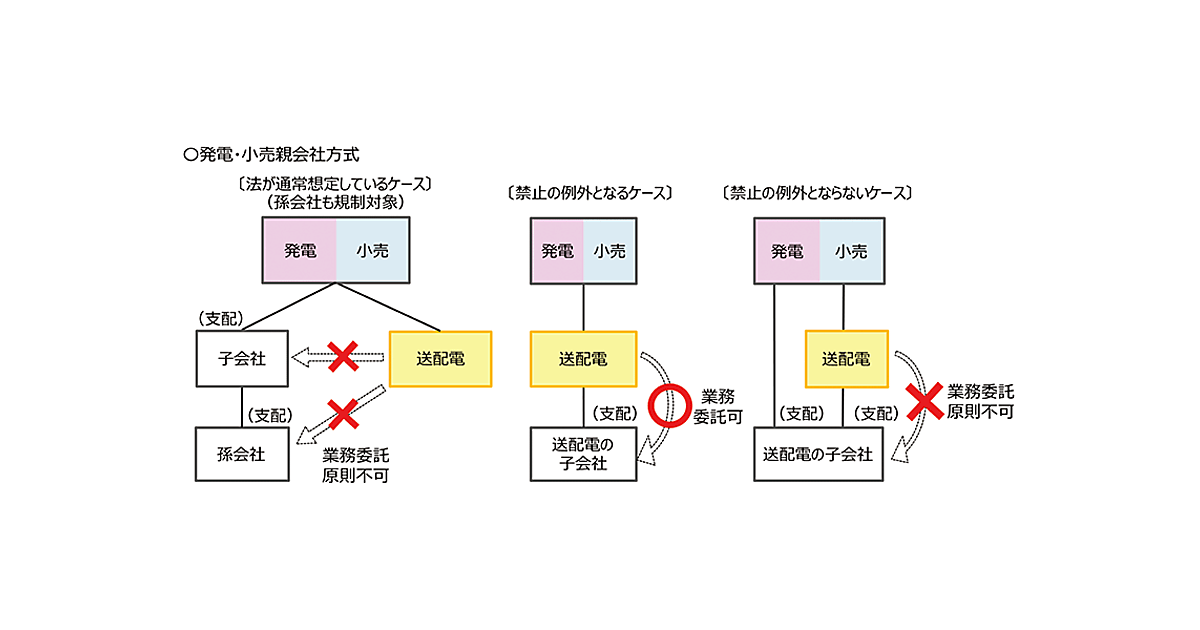例えば、≪業務の受委託等に関する規律≫では、例外として許容される業務委託の内容(送配電 → 発電・小売電気等)の場合、改正電気事業法では、一般送配電事業者がグループ内の発電・小売電気事業者等およびその子会社等に、送配電業務を委託することを原則禁止している。しかし、それらの禁止の例外については、今回の改正で、図のようにすることが適当であるとされた注2。
