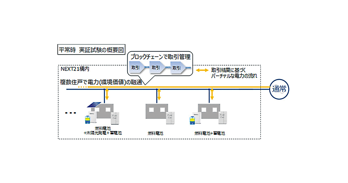 大阪ガスは、同社が保有する実験集合住宅「NEXT21」(所在地:大阪市天王寺区)において、2019年3月からブロックチェーン技術(分散型台帳技術)を使用した、電力の個人間取引に関する居住者実証試験を行うと発表した(図)