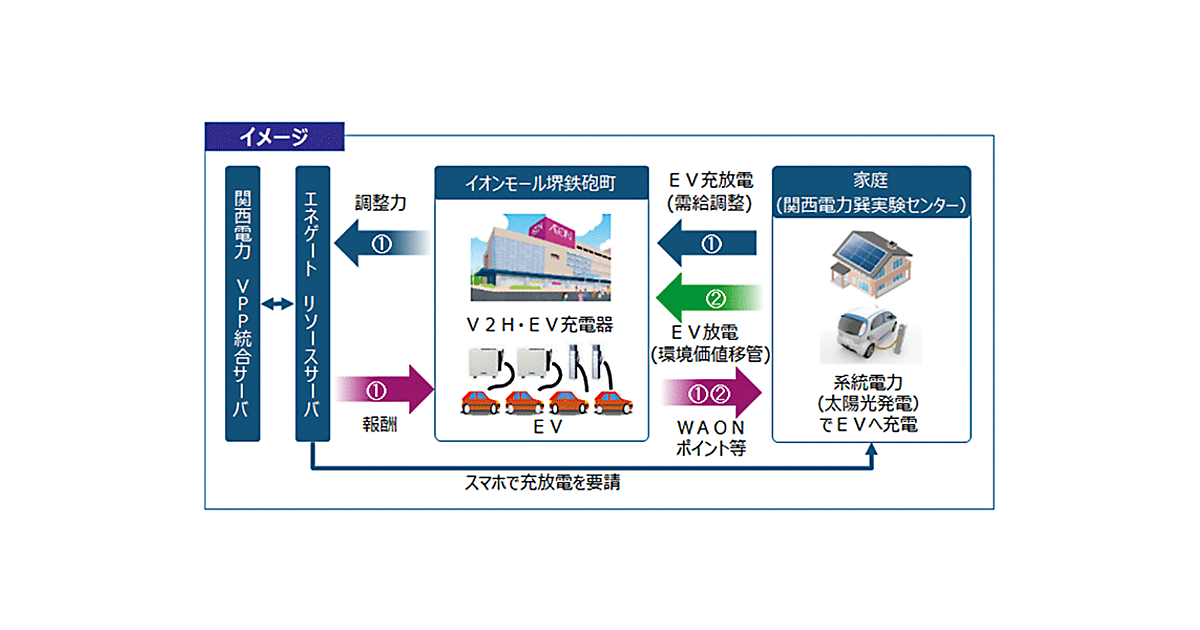 イオン株式会社(以下、イオン)、イオンモール株式会社(以下、イオンモール)、関西電力株式会社(以下、関西電力)、株式会社エネゲート(以下、エネゲート)および堺市は、2019年7月25日、イオンモール堺鉄砲町において、V2H充放電器・EV(電気自動車)充電器を活用したVPP(バーチャルパワープラント)実証(以下、VPP実証)と、ブロックチェーン技術を活用した環境価値取引実証(BC実証)を開始した(注1)。