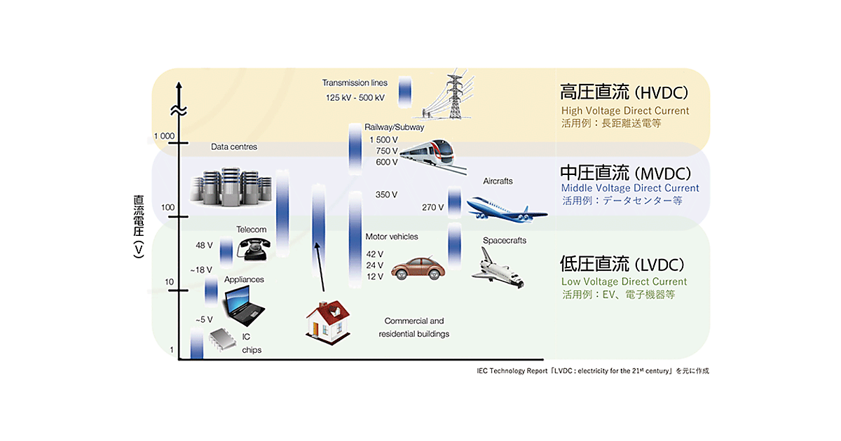 図1に示すように、①高圧直流(HVDC。例:100kV以上の長距離直流送電網)、②中圧直流(MVDC。例:5kVのデータセンター、1.5kVの電車など)、③低圧直流(LVDC。例:12V〜42VのEV、電子機器など)のようなイメージとなる。