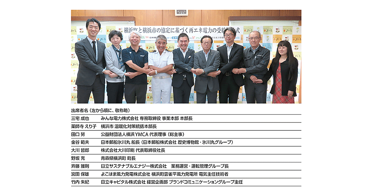同日、横浜町役場で「横浜町と横浜市の協定に基づく再エネ電力の受給開始式」が開催され、横浜市内の需要家6社のうち大川印刷、日本郵船、横浜YMCAの3社に加えて、日立サステナブルエナジー、みんな電力、よこはま風力発電の供給者、関係自治体である横浜町、横浜市などが参加した。また、2018年2月から稼働している、横浜町区域内の横浜町雲雀平(ひばりだいら)風力発電所(14基、32.2MW)の視察も行われた。