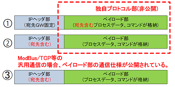 図5②は、IPヘッダ内にはGW向けIPヘッダも、GWの先にあるバルブなどのIPアドレスなども含んでいるが、ペイロード部が独自プロトコル(非公開)のケースであるため、①のケースと同様にペイロード部の解析は困難である。