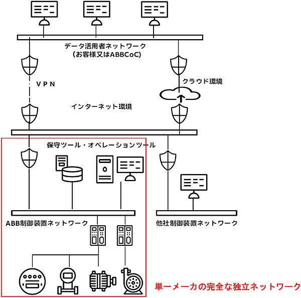 図5③は、IPヘッダもペイロード部も公開されているModbus/TCPなどの通信仕様を使用するIPパケットであり、①、②に比べて盗聴や解析が容易となっている。そこで、セキュア(安全)な通信を行うため、ファイアウォールをはじめ、暗号化された通信路であるインターネットVPNや前出の表2に示したさまざまな国際標準に対応させて、サイバー攻撃に備えている。