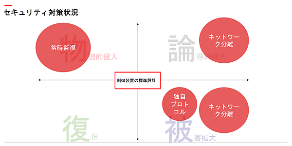 | 【2】論理的侵入 | ネットワーク分離:ネットワークを介して、資産にアクセスし、リモート操作や情報窃取を行う攻撃への対策 | ⇒インターネット回線や、オフィスネットワークと接点を作らず、ネットワーク越し(経由)の侵入や乗っ取りを防ぐ。 |