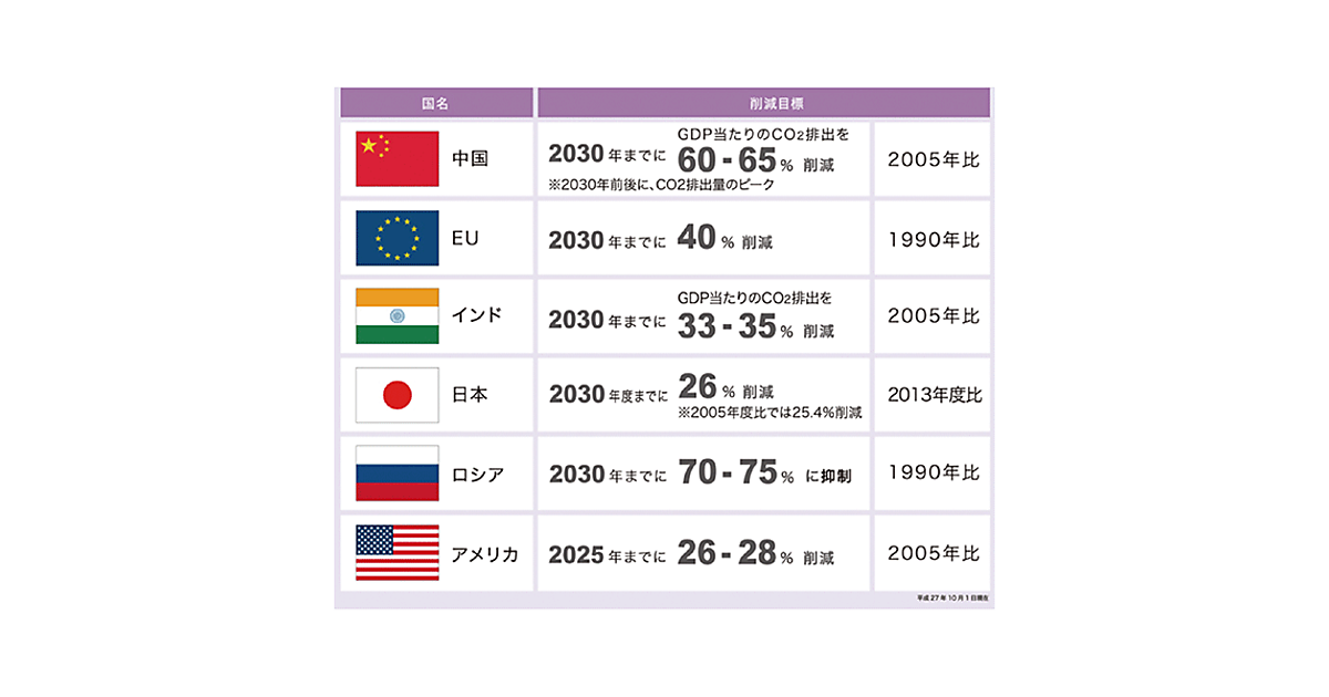 これ以外にも、2020年2月までに国連に提出することになっている、各国の2030年までの温室効果ガス削減目標についても、可能なかぎり高い野心(Ambition)を示すことを促すにとどまっている。参考までに、現状の各国の温室効果ガス削減目標の例を表1に示す。