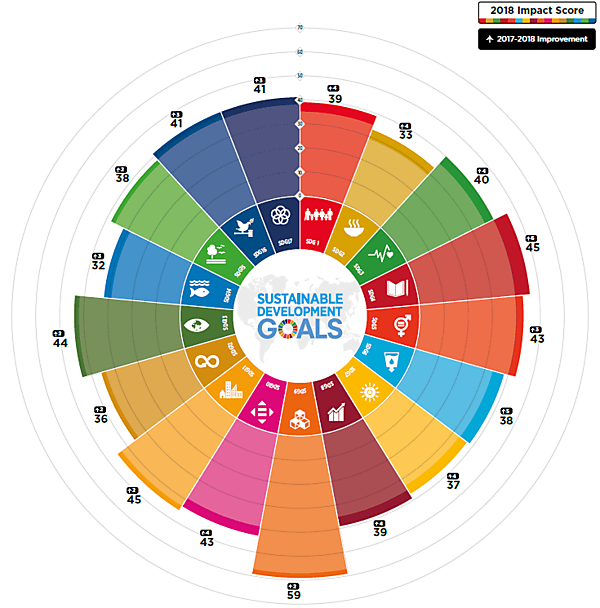 「2019 Mobile Industry Impact Report: Sustainable Development Goals」では、このような取り組みが、SDGsの目標達成にどの程度貢献しているのかをSDG mobile impact scores(持続可能な開発目標に関するモバイルの影響スコア)という指標を定めて定量的に示している。これによって現在の取り組み状況を正確に把握し、今後のさらなる取り組みを促すことを目指している。このSDG mobile impact scoresの最新版(2018年版の評価)を示したものが図2である。