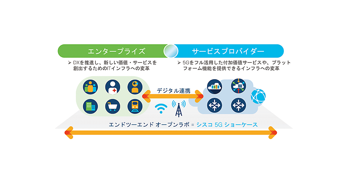 すでにシスコは、大手企業や自治体とともにローカル5Gのプロジェクトやトライアルを開始しているが、5Gによって新たな価値を提供するためには、企業や業界を超えたデジタル連携が求められる。このため、サービスプロバイダーと企業側のネットワークが、エンドツーエンド注6でセキュアに連携し、その運用の自動化や可視化を実現する必要がある。そのためには、双方のネットワークアーキテクチャの変革が求められる。