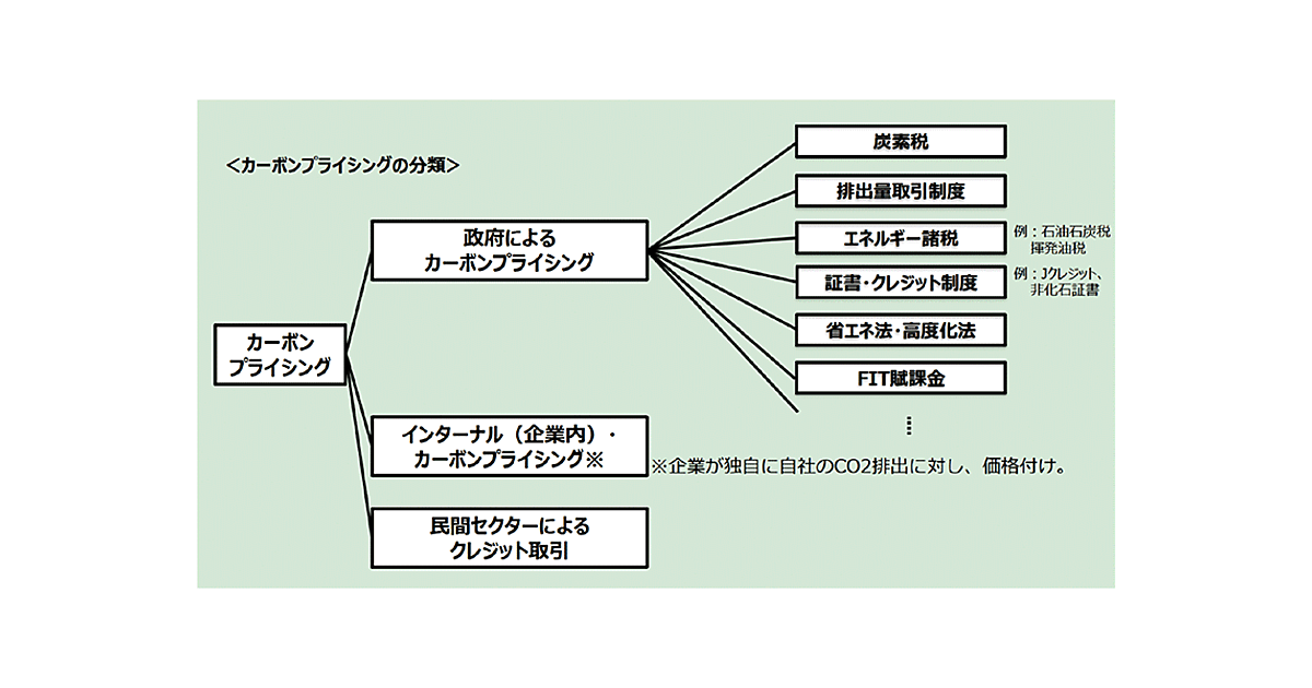 カーボンプライシング(Carbon Pricing、炭素の価格付け)とは、CO2排出に価格を付け、排出者の行動を変容させる(変えさせる)政策手法。図に示す「炭素税」や排出量の上限規制を行う「排出量取引制度」などのほか、国境調整措置なども含め、さまざまな手法が存在している。