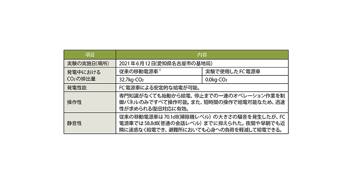 実証実験は、愛知県名古屋市にある基地局の年次計画停電期間である2021年6月12日に、FC電源車からの給電を実施し、FC電源車の発電性能と操作性、静音性を検証した。実験結果の概要は表1の通り。