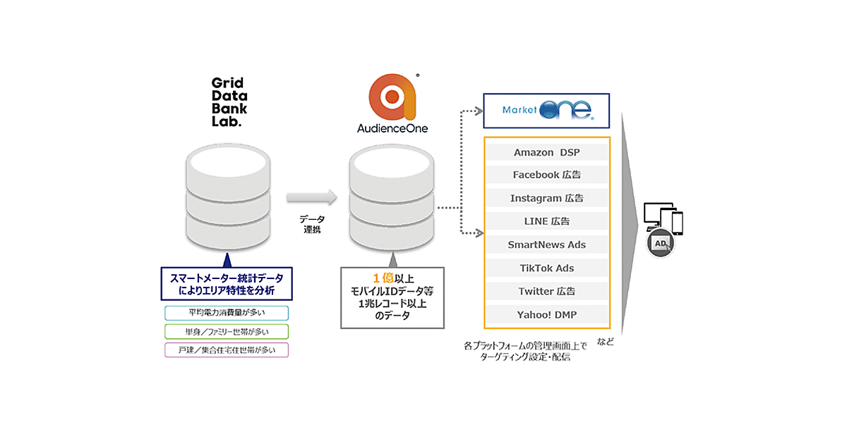 電力データを活用した社会課題解決などを目指して設立されたグリッドデータバンク・ラボ有限責任事業組合(以下、GDB)注1と、博報堂DYホールディングス傘下のデジタル・アドバタイジング・コンソーシアム(DAC、1996年12月設立)は、2021年8月31日、GDBのスマートメーター統計データとDACの「AudienceOne」(オーディエンスワン)プラットフォーム注2との連携を開始した(図)。