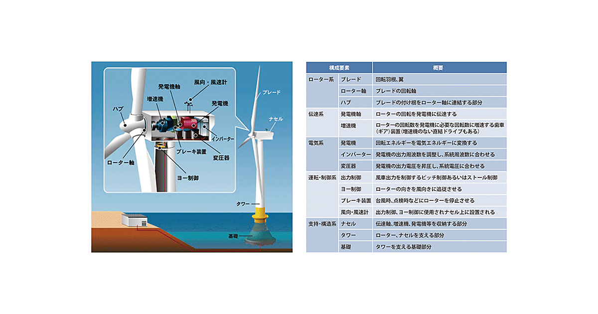 風力発電には大きく、陸上風力発電と洋上風力発電がある。図1は、洋上風力発電の基本的な仕組みを示している。