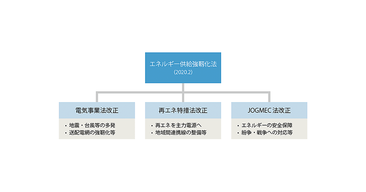 正式名称は「強靱かつ持続可能な電気供給体制の確立を図るための電気事業法等の一部を改正する法律」。2020年2月25日閣議決定、2020年6月5日国会で可決・成立し、一部の規定を除き、2022年4月1日に施行。