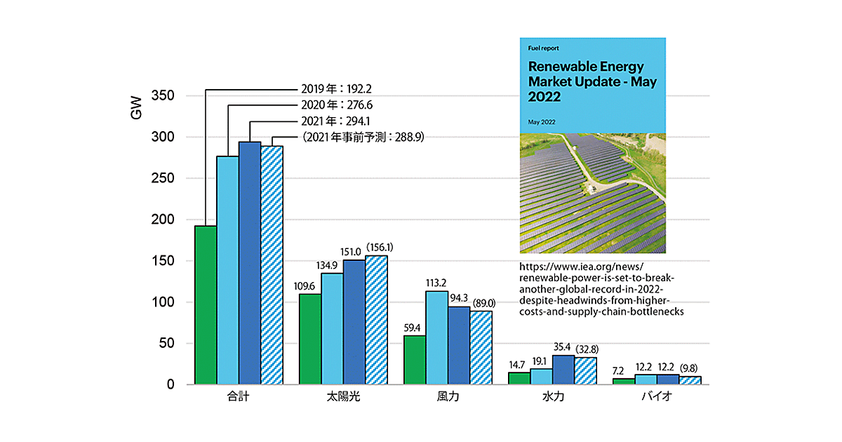 COVID-19のパンデミックとロシアのウクライナ侵攻の影響による、天然ガス・石炭等の高騰、それに伴う電力料金の高騰が進行する世界的なエネルギー危機の中、IEA(国際エネルギー機関)は、『再生可能エネルギー市場の最新情報 ―2022年5月 =2022年と2023年の見通し=』(全28ページ)(注1)を発表した。