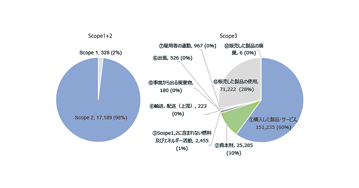 一方、サプライチェーンの上流および下流の間接的な温室効果ガスの排出量を算定するScope3においては、①IIJのシステムインテグレーションの提供時の機器などの仕入とその販売、②購入した製品・サービス、③販売した製品の使用とサービス設備等に利用される機器等の購入などの「資本財」の割合が大きく、これら排出量の98%を占めている。