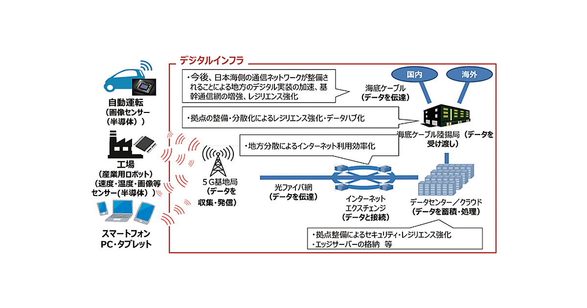 図2は、デジタル田園都市国家構想実現におけるデジタルインフラの整備内容を示したものだ。社会や産業(図2左)のデジタル化よって、新しいサービスを提供するには、あらゆる場所から通信(例:5G基地局)などを使用してデータを収集し、データセンター(クラウド)で処理された後に、また現場にフィードバックするという、データの循環が必要となる。