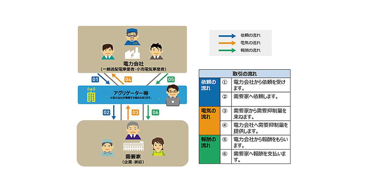 アグリゲーションコーディネーター(AC):Aggregation Coordinator、リソースアグリゲーターが制御した電力量を束ね、一般送配電事業者や小売電気事業者と直接電力取引を行う事業者