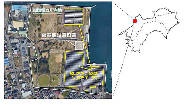 四国電力が出資する松山みかんエナジー合同会社(以下、松山みかんエナジー)は、愛媛県松山市に「松山蓄電所」を建設(図1、2023年8月着工)、2025年中の商業運転を目指している。同蓄電所は、四国電力株式会社(以下、四国電力)の松山太陽光発電所(出力:2,042kW:約2MWのメガソーラー)に隣接する場所に設置され、その定格出力は12MW、定格容量は35.8MWhだ。この規模の蓄電所としては四国初となる。