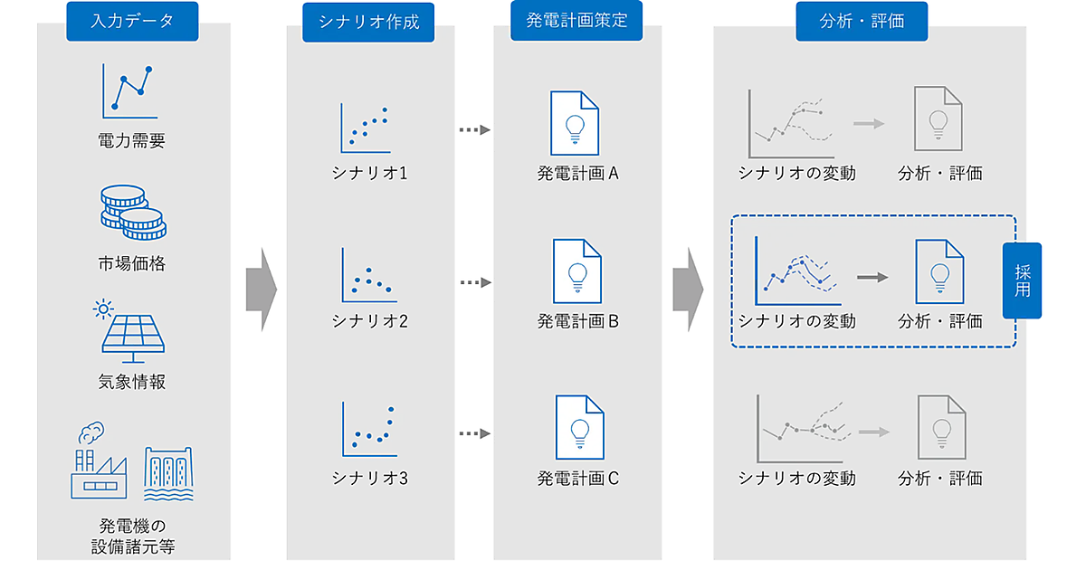 さらに、このシミュレーションではAI最適化技術を導入し、想定される電力需要や市場価格などをもとにした複数の需給シナリオを作成し、シナリオごとに発電計画や期待収益を算定。それらを四国電力が分析・評価し、最適なものを選択、実行する(図)。これによって、電力需要の変化に対応した経済的で効率的な発電計画の立案、実行が可能となり、その結果、収益改善が促進される。
