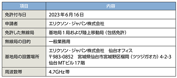 出所 東北総合通信局報道資料、令和5(2023)年6月16日、「エリクソン・ジャパン株式会社のローカル5Gの無線局に免許 -企業等が業務に使用する目的で開設するローカル5Gの無線局としては仙台初-」をもとに編集部で作成