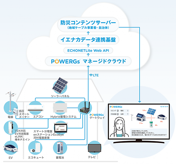 インターネット時代にスマートフォンが急速に普及しているとはいえ、テレビは、依然として家庭の中心的な家電機器である。そこで、図3の上部に示すように、防災コンテンツサーバ(自治体・地域ケーブル事業者が設置)に対して、イエナカデータ連携基盤注9を経由して、ECHONET Lite Web API注10を使ってPOWERGsマネージドクラウドにつないでおく。すると自治体や電力会社から災害や停電の通知が発せられると、テレビに「この地域の〇〇で災害が発生しています」「停電が発生しそうですので、家電機器の状態を確認し、再エネ電気をアクティブにする準備をしましょう(例:EVの電池を家庭に送るようにしましょう)」というようなメッセージを表示する仕組みが検討されており、ACCESSではその実証実験を行い同実証システムを公開した注11。