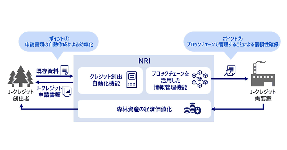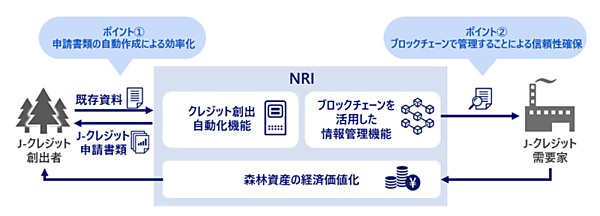 これらの課題解決のために野村総研では、申請書作成の手続きを自動化などによって効率化する仕組みを提供する。さらに、CO2吸収量などの情報管理における信頼性確保のために、暗号技術であるブロックチェーンによる基盤を構築する。