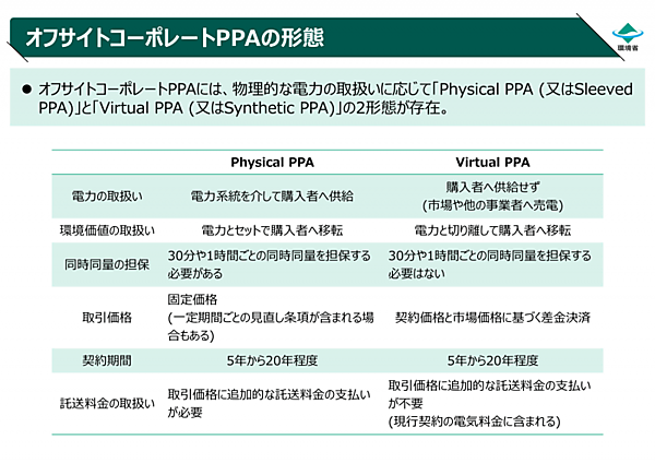 図2 オフサイトコーポレートPPAの形態:フィジカルとバーチャル