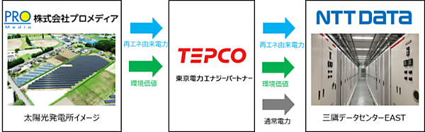 今回発表された電力の需要地は、東京・三鷹市にあるNTTデータグループの三鷹データセンターEAST。電力は、株式会社プロメディア(以下、プロメディア。株式会社アドバンスの関連会社)が埼玉県と栃木県に新設する太陽光発電所で発電した電力を、東京電力エナジーパートナー株式会社が2024年8月以降、三鷹データセンターEASTに供給する(図3)。