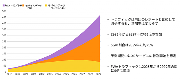 この結果に基づき、今後のトラフィックとその伸びを予測すると、トラフィックは2023年から2029年の6年間に約3倍になる(図4)。