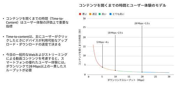 この調査では、ユーザーが「適正」と感じるのは2.5秒以下で、1.5秒になると「良い」と感じるという結果となっている(図10)。逆に4秒以上になると「悪い」と判断される。この秒数は、アップリンク(上り)とダウンリンク(下り)の総合的なネットワーク速度で決まり、2.5秒で表示するためには通信速度は10Mbps程度、1.5秒の場合は20Mbpsが必要となる。