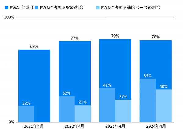 その一方で、xDSL注3のような有線通信による固定ブロードバンド回線の代替として、無線通信を使うFWA(Fixed Wireless Access)サービスが伸長している(図7)。2024年4月現在、プロバイダによるグローバルFWAサービスの提供は全体の78%、その中で5Gサービスを展開しているのは53%。また2022年4月時点の調査から開始している、回線速度ベースのサービス展開は21%であるが、それが2024年4月時点では40%とほぼ倍増している(図8)。