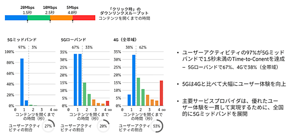 それによれば、5Gは4Gに比べて短時間にコンテンツを画面に表示、つまりユーザー体験を向上している。図11に見られるように、とりわけ5Gミッドバンドは、前述したTime-to-Contentで「良い」とされる1.5秒未満の表示を97%達成し、5Gローバンドに比べてもさらに際立つ差を示している。5Gローバンドは電波の到達距離が長い反面、伝送速度は高速になりにくい。それに対してミッドバンドでは到達距離は短くなるが、伝送速度が速くなる。このミッドバンドの特徴をユーザー体験向上に活かすべき、と鹿島氏は述べる。
