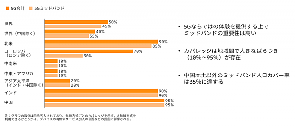 ちなみに現在、5Gの人口カバー率は2029年には80%(前出の図2)に達すると予測されている。その中で、2023年末時点での5Gミッドバンドのカバレッジは全世界で45%、中でも北米やインド、中国では高い数値を示している。一方、日本を含むアジア太平洋地域(インド・中国を除く)は20%に留まっている(図12)。