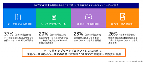 図13に示すように、まず多いのがデータ量による階層化、日本ではデータプランなどで広く普及しているサービスだ。そしてビデオストリーミングやゲームなどのアプリケーション・バンドル、さらに回線速度向上や最低スループットや低遅延を保証するQoS(Quality of Service)ベースのサービスなども、ユーザーから関心が寄せられている。