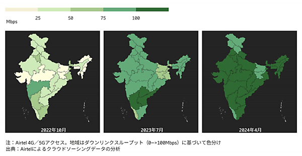 エリクソンとインドの通信事業者Airtel(エアテル)による事例。同社は2022年からインド国内に5Gネットワークを短期間で整備したが、その際、ミッドバンドを主に利用し、ほぼ全土でスループット100Mbps以上を実現している(図16)。