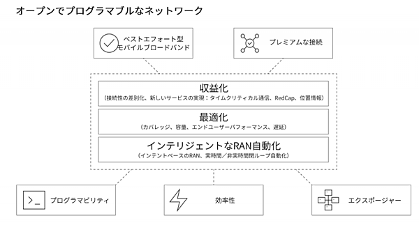 ネットワーク設定の際、従来のようにデータや指標に合わせて設定するのではなく、あらかじめプログラミングされた目標に合わせてネットワークシステムが自律的に設定調整を行って運用する仕組みを開発している。これによって収益の最大化、ネットワーク運用の最適化、RAN注6自動化を目指す(図17)。