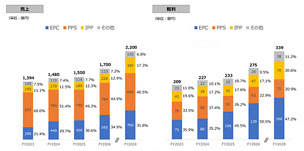 その中で環境エネルギー事業の売上げは1,394億円で、今後2026年に1,700(営業利益120)億円、2029年には同2,200億円(同170)億円に成長させたいとしている。