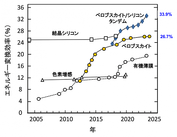 ペロブスカイトの発電効率:結晶シリコン「26.1%」を上回り「26.7%」へ