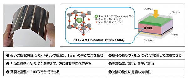 図4 薄く軽く、曲げても発電できるフィルム型PSC(左)の特徴とその結晶構造