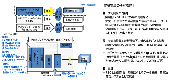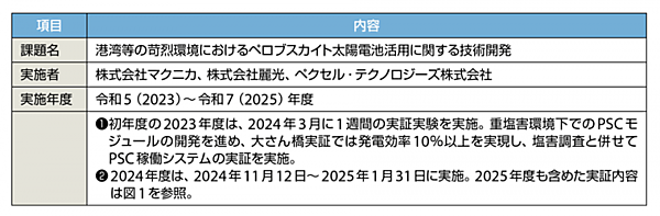 この実証事業にマクニカ、ペクセル・テクノロジーズ、麗光の3社が、「港湾など苛烈環境下におけるPSC(ペロブスカイト太陽電池)の活用に関する技術開発」を提案した(表1、図1)。同提案は2023年度に採択され、同年度から3カ年の予定で実験を行っている。