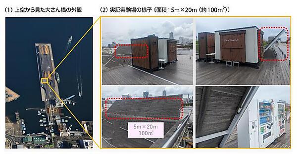 実証実験場は、横浜港大さん橋の屋上フロアに約100m2(5m×20m)のスペースで設置され、そこにPSCパネルを貼って実験を行っている(写真3)。